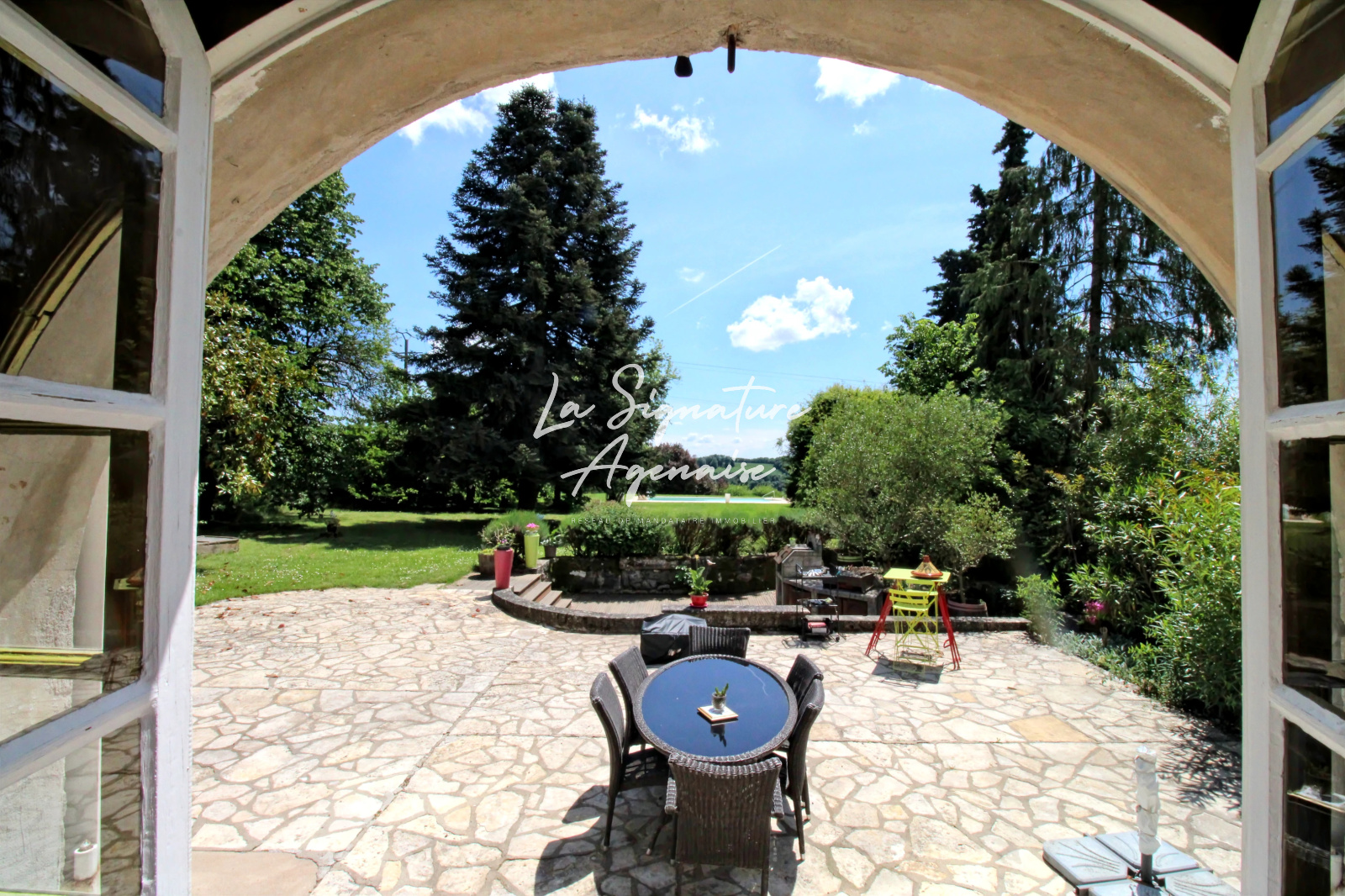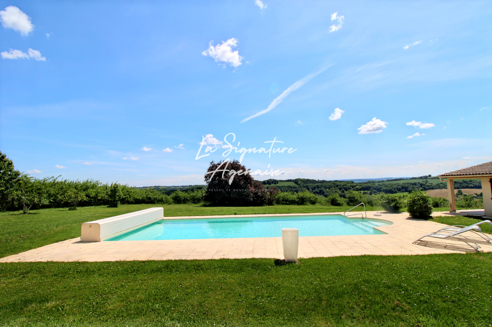 À l’extérieur, un jardin arboré complète harmonieusement l’ensemble, bordé de champs de pruniers et idéal pour les amoureux de la nature. La piscine chauffée, équipée d’un volet roulant de sécurité, s’intègre parfaitement au paysage et offre un cadre de détente exceptionnel. Un pool house, un garage et de nombreux espaces de rangement viennent parfaire les prestations.