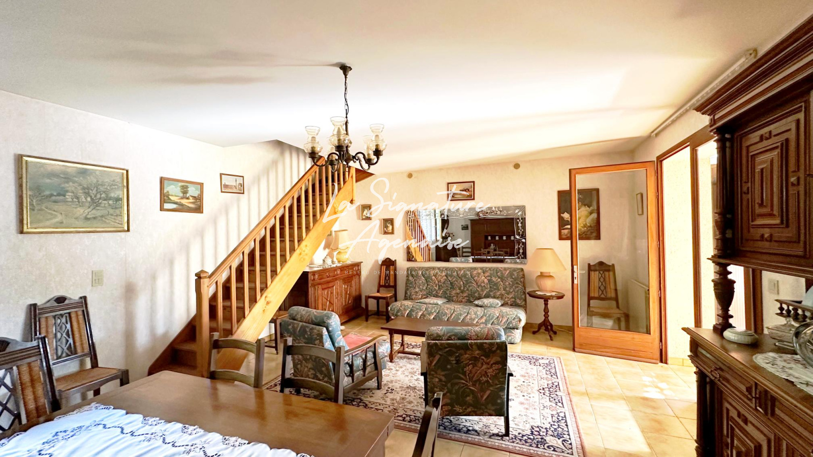 Dès l’entrée, vous découvrirez une grande cuisine équipée avec une cheminée ouverte sur un séjour et un espace salle à manger donnant sur une véranda.