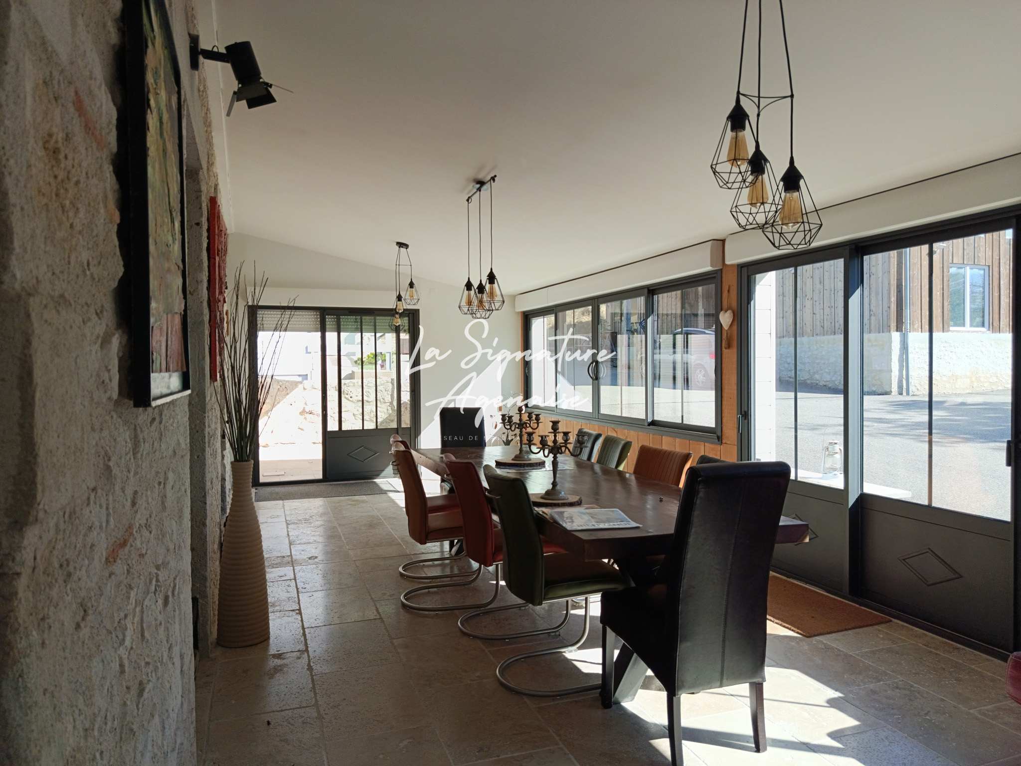 La maison principale en pierre, entièrement rénovée en 2013, développe environ 170 m² habitables. Elle allie charme de l’ancien et modernité, avec une véranda lumineuse, un vaste séjour-salon et une cuisine équipée contemporaine.
